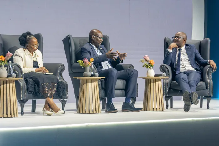 From left to right: Phindile Masangane, group executive at DBSA; Patrick Dlamini, Group CEO of the Public Investment Corporation; and Zuko Godlimpi, deputy minister of the Department of Trade, Industry and Competition, during a panel discussion at the 6th South Africa Investment Conference on Tuesday.