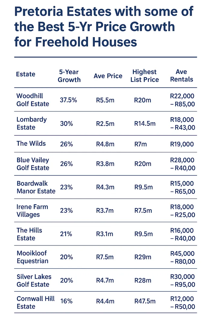 Pretoria Estates with some of the best five-year price growth for freehold houses.