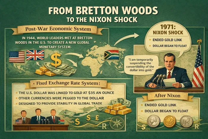 When the rand was introduced in 1961, it formed part of the global fixed exchange rate framework created after the Second World War under the Bretton Woods system.