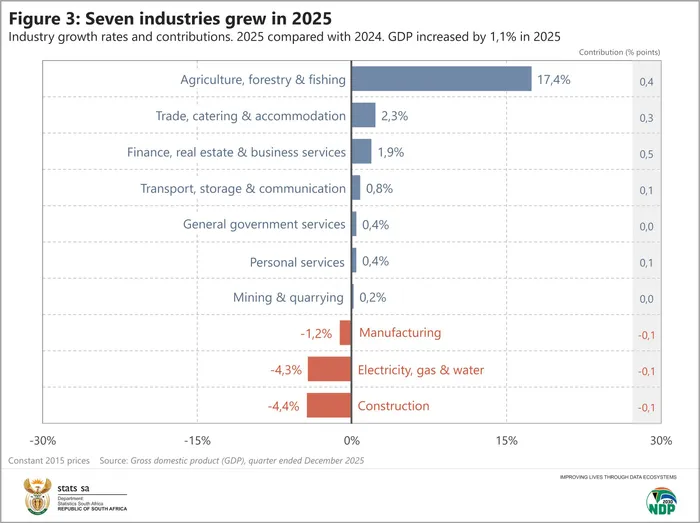 Statistics South Africa on Wednesday reported that the economy expanded by 0.4% in the fourth quarter of 2025, lifting full-year growth to 1.1% – the strongest annual performance since 2022, but still weak by historical standards.