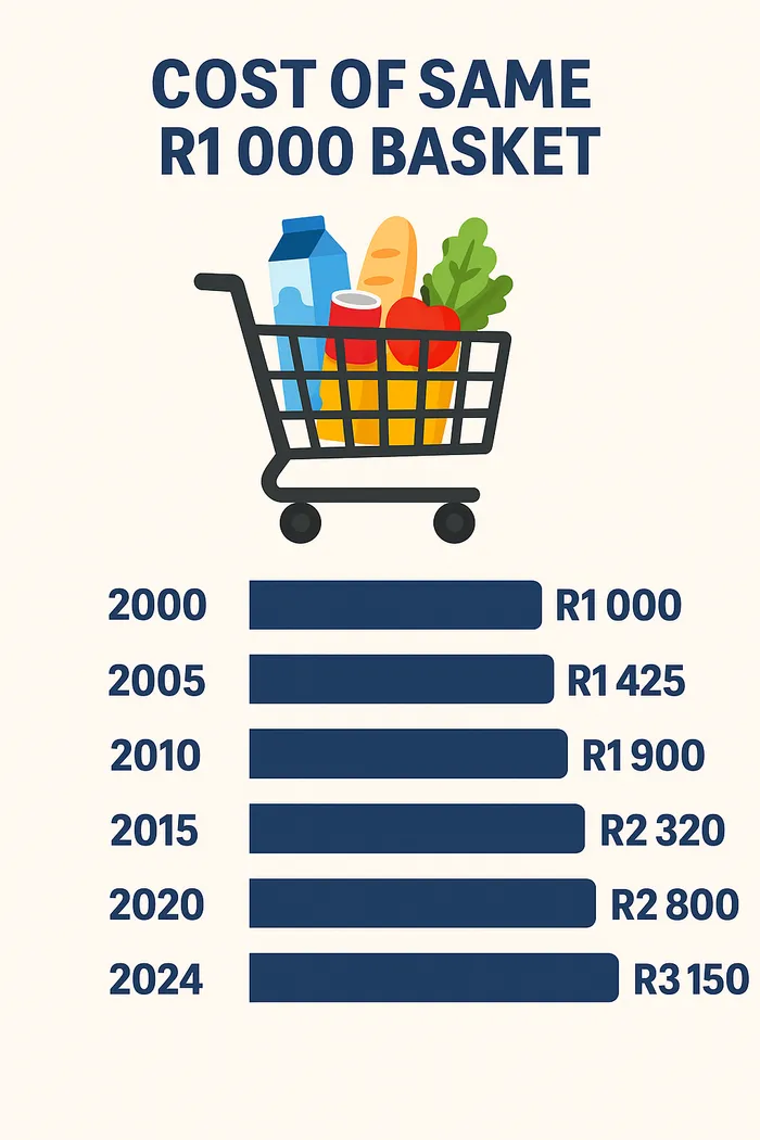 To put all this in context: a trolley of groceries that cost you around R1 000 at the start of the century will now cost R3 733, according to a website set up by Renier Crause.
