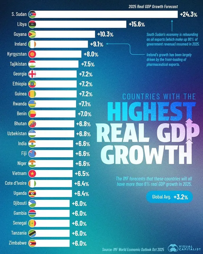 As South Africa’s moribund economy continues to limp along, war-torn South Sudan has been listed as the world’s fastest-growing economy in 2025, according to data storytelling platform Voronoi.