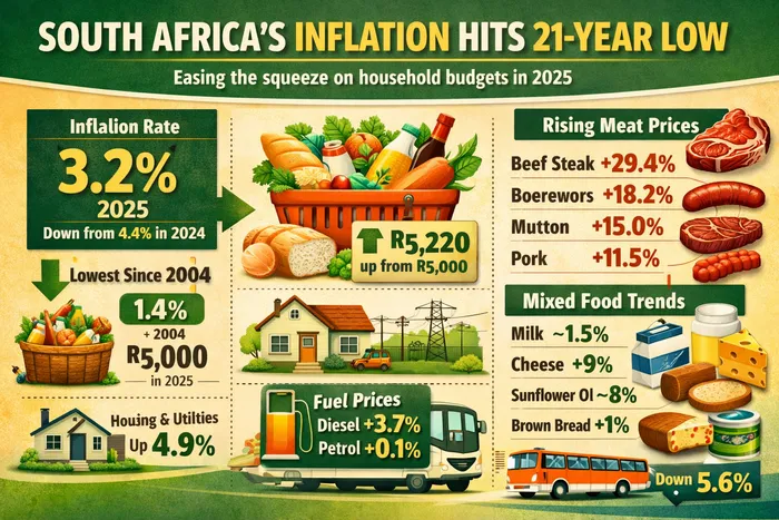 South Africa’s inflation rate in 2025 hit its lowest level in more than two decades, easing price pressures on households, Statistics South Africa said.