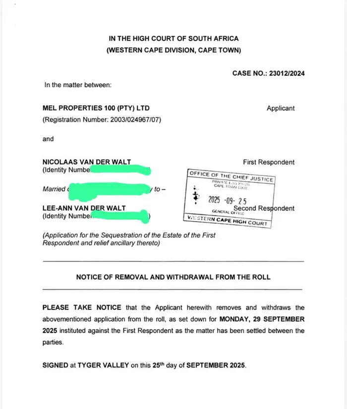 This week court documents show that the case against the Van der Walts to have them declared insolvent was withdrawn, following the settling of the matter.