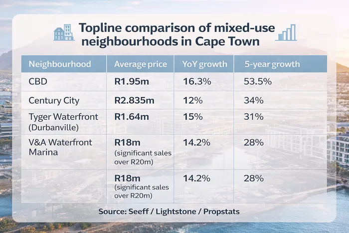 Mixed-use neighbourhoods are generally highly sought by investors for high rental demand and stable yields, said Seeff. They often boast a high percentage of residential rental investments with yields of 7-10%. V&A Waterfront is lower at around 4-6% due to the high average prices.