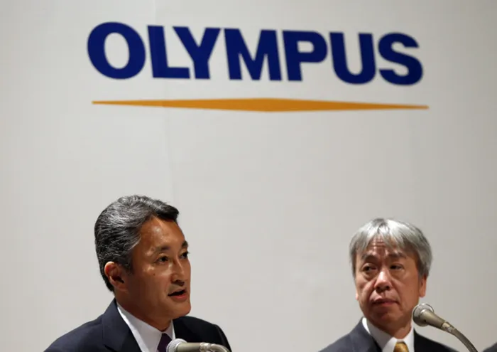 Sony Corp's President and Chief Executive Officer Kazuo Hirai (L) and Olympus Corp's President Hiroyuki Sasa attend a joint news conference in Tokyo October 1, 2012. Sony Corp will pay 50 billion yen ($643.5 million) to become the biggest shareholder in Olympus Corp, and establish a company with the cash-strapped Japanese camera and endoscope maker to develop medical equipment. Sony Corp's President and Chief Executive Officer Kazuo Hirai (L) and Olympus Corp's President Hiroyuki Sasa attend a joint news conference in Tokyo October 1, 2012. Sony Corp will pay 50 billion yen ($643.5 million) to become the biggest shareholder in Olympus Corp, and establish a company with the cash-strapped Japanese camera and endoscope maker to develop medical equipment.