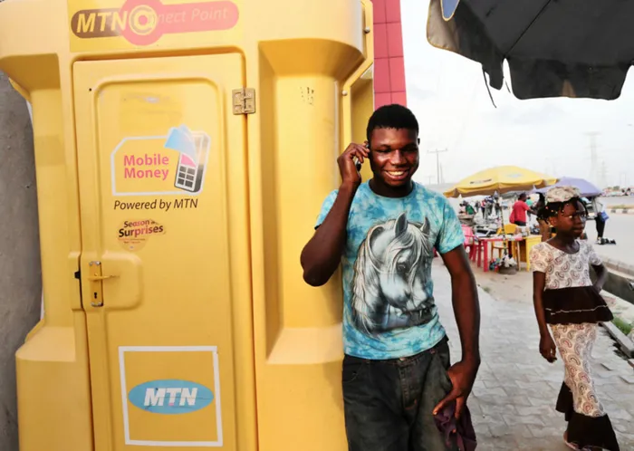 A customer uses a cellphone beside an MTN Connect Point in Lagos, Nigeria. File picture: George Osodi A customer uses a cellphone beside an MTN Connect Point in Lagos, Nigeria. File picture: George Osodi
