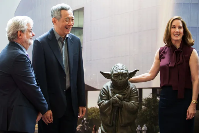 Lee Hsien Loong, Singapore's prime minister, center, billionaire George Lucas, filmmaker and founder of Lucasfilm Ltd., left, and Kathleen Kennedy, president of Lucasfilm Ltd., unveil a statue of Star Wars character Yoda during the opening ceremony of the company's Sandcrawler building, home to Lucasfilm's Singapore unit, in Singapore. Photographer: Nicky Loh/Bloomberg Lee Hsien Loong, Singapore's prime minister, center, billionaire George Lucas, filmmaker and founder of Lucasfilm Ltd., left, and Kathleen Kennedy, president of Lucasfilm Ltd., unveil a statue of Star Wars character Yoda during the opening ceremony of the company's Sandcrawler building, home to Lucasfilm's Singapore unit, in Singapore. Photographer: Nicky Loh/Bloomberg