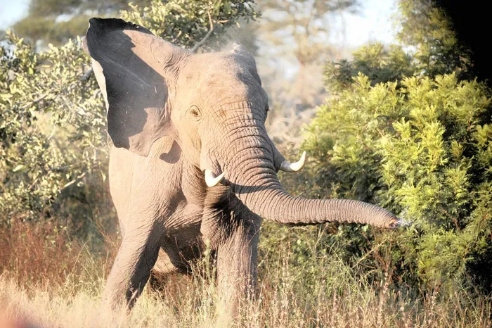 EARLY WARNING: A bull elephant mock charges in Kruger National Park, where statistics show poaching is on the decline. EARLY WARNING: A bull elephant mock charges in Kruger National Park, where statistics show poaching is on the decline.