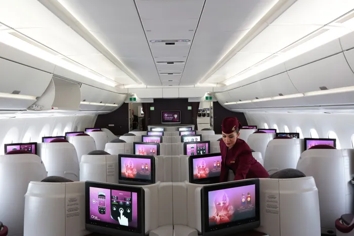 A flight attendant arranges a passenger booth in the first class cabin aboard an Airbus SAS A380 aircraft, operated by Qatar Airways Ltd., on the opening day of the 51st International Paris Air Show in Paris, France, on Monday, June 15, 2015. Photographer: Jason Alden/Bloomberg A flight attendant arranges a passenger booth in the first class cabin aboard an Airbus SAS A380 aircraft, operated by Qatar Airways Ltd., on the opening day of the 51st International Paris Air Show in Paris, France, on Monday, June 15, 2015. Photographer: Jason Alden/Bloomberg