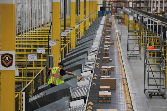 FILE PHOTO: Amazon packages are pushed onto ramps leading to delivery trucks by a robotic system as they travel on conveyor belts inside of an Amazon fulfillment center on Cyber Monday in Robbinsville, New Jersey FILE PHOTO: Amazon packages are pushed onto ramps leading to delivery trucks by a robotic system as they travel on conveyor belts inside of an Amazon fulfillment center on Cyber Monday in Robbinsville, New Jersey