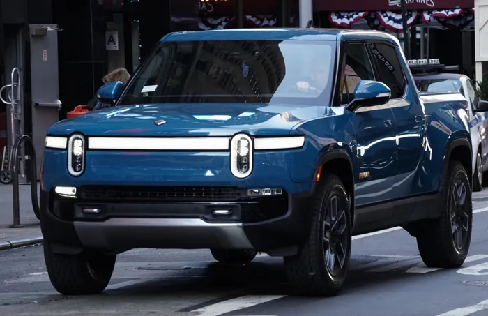 A Rivian R1T electric pickup truck during the company's IPO outside the Nasdaq MarketSite in New York. Bloomberg photo by Bing Guan