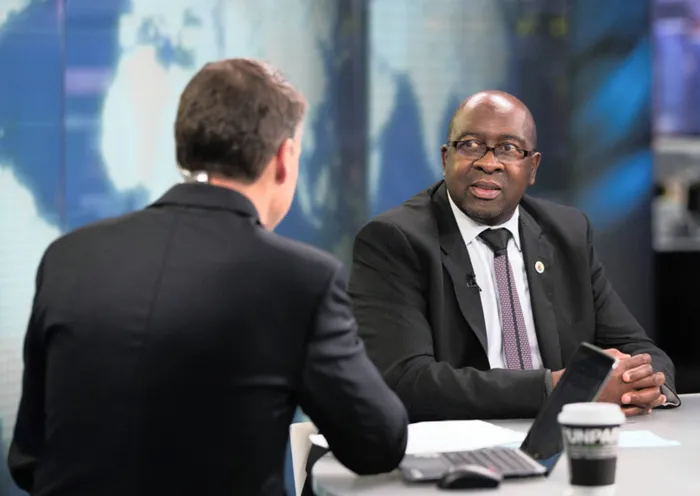Finance Minister Nhlanhla Nene (right) during a Bloomberg Television interview in London yesterday. He said South Africa's government would postpone some of its spending programmes to help curb the budget deficit as economic growth slows. Photo: Bloomberg Finance Minister Nhlanhla Nene (right) during a Bloomberg Television interview in London yesterday. He said South Africa's government would postpone some of its spending programmes to help curb the budget deficit as economic growth slows. Photo: Bloomberg