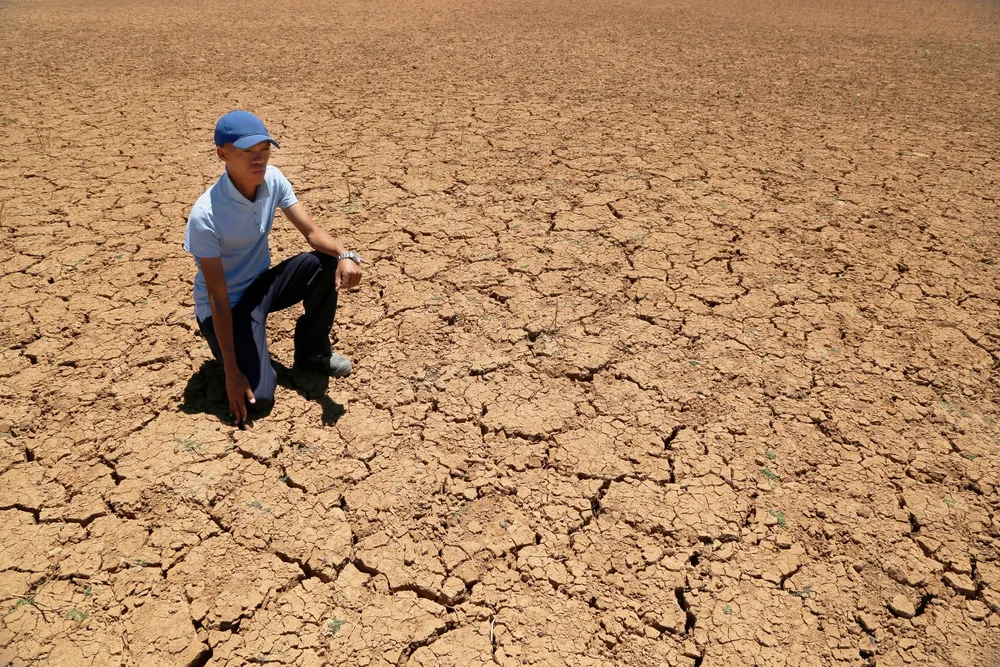 In this photo taken on Thursday, Nov. 14, 2019, Paul van Wyk, a small scale farmer, kneels down in a cracked bed of a water pan in Vosburg, South Africa. The worst drought some farmers have seen in decades is affecting much of southern Africa. The United Nations says more than 11 million people now face crisis levels of food insecurity. (AP Photo/Denis Farrell)