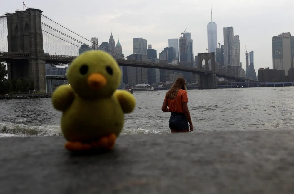 A girl walks on the shore of Brooklyn Bridge Park in the Brooklyn borough of New York