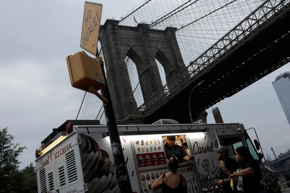 People buy ice cream at an ice cream truck under the Brooklyn bridge in New York