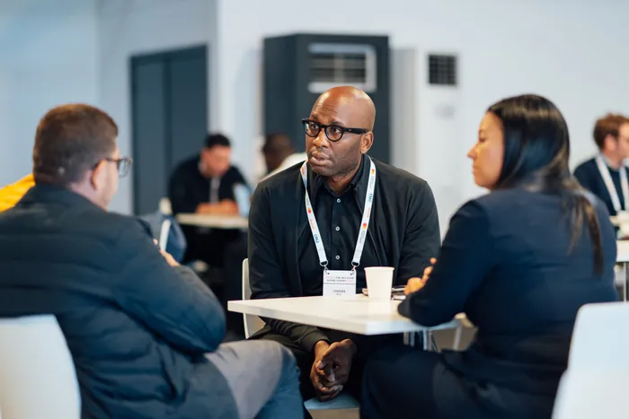 Chijioke Dozie, the co-founder and CEO of Carbon, engaging with fellow delegates at the Fintech for Inclusion Global Summit 2024 in London, UK. Photo: Accion