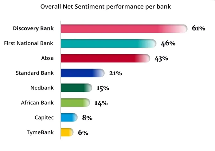Discovery maintained its position as South Africa’s most positively spoken-about bank, achieving an industry-leading 61% Net Sentiment. This was driven by praise for its rewards programmes, personalised benefits, and overall banking experience, along with campaign-linked advocacy through hashtags such as #DiscoveryBestBank and #TreatMeTuesday.