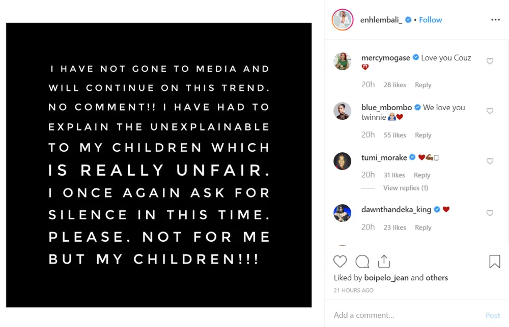 Mbali previously confirmed the divorce rumours in November with a post on her Instagram page.