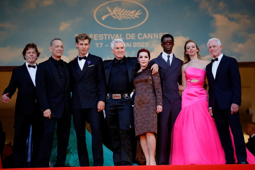 The 75th Cannes Film Festival - Screening of the film "Elvis" Out of Competition - Red Carpet Arrivals - Cannes, France, May 25, 2022. Director Baz Luhrmann, Jerry Schilling, Priscilla Presley, cast members Tom Hanks, Austin Butler, Natasha Bassett and Alton Mason pose. REUTERS/Sarah Meyssonnier REFILE - CORRECTING ID