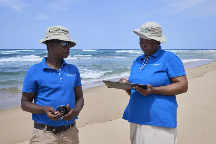 Jane Mthembu with her colleague capturing data on Bhanga nek Beach