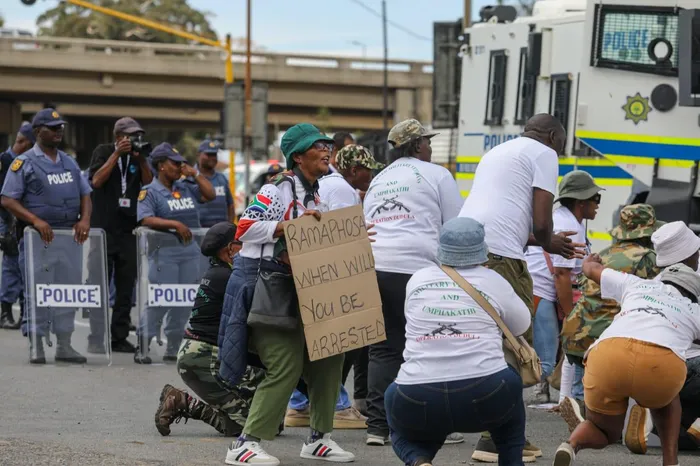 Operation Dudula members protest in front of the police close to the G20 Leaders' Summit venue.