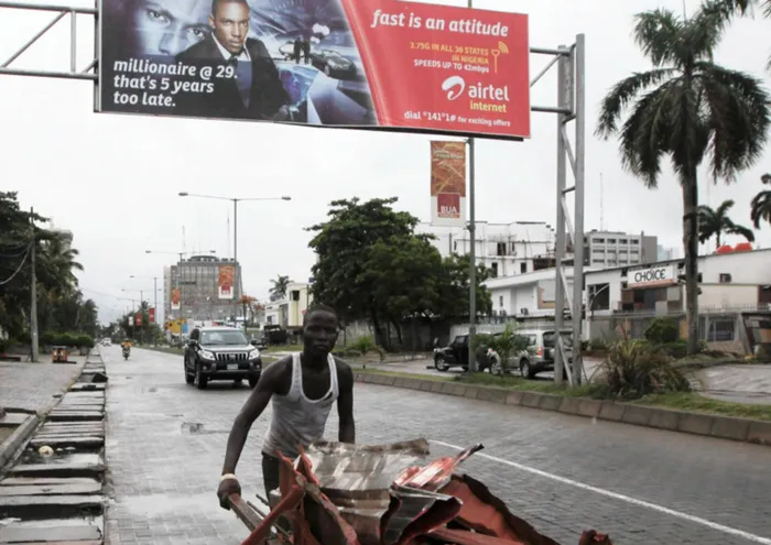 A man in Lagos pushes his cart past a billboard advertising Airtel Africa, Nigeria's third-biggest cellular operator. The unit of Indian wireless service provider Bharti Airtel says data usage has doubled in a year in the 17 African countries in which it operates. File photo: AP A man in Lagos pushes his cart past a billboard advertising Airtel Africa, Nigeria's third-biggest cellular operator. The unit of Indian wireless service provider Bharti Airtel says data usage has doubled in a year in the 17 African countries in which it operates. File photo: AP