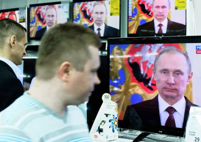 A Moscow shop shows a broadcast of Russian President Vladimir Putin's state-of-the-nation address on Thursday, in which he vowed not to abandon the spending promises he made last year. Photo: AP A Moscow shop shows a broadcast of Russian President Vladimir Putin's state-of-the-nation address on Thursday, in which he vowed not to abandon the spending promises he made last year. Photo: AP