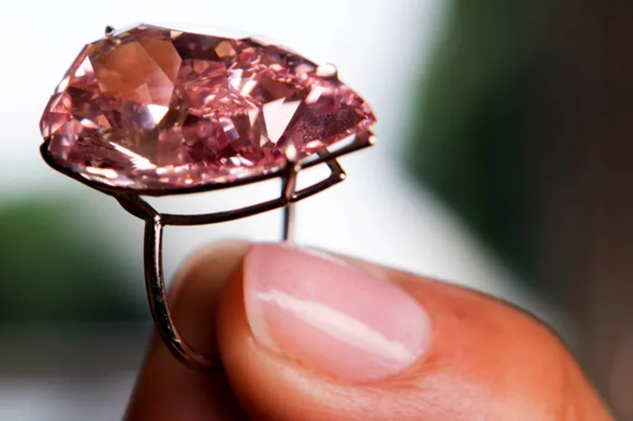 A model displays "The Unique Pink", the largest Fancy Vivid Pink pear shaped diamond ever offered at an auction. File picture: Laurent Gillieron, Keystone, via AP A model displays "The Unique Pink", the largest Fancy Vivid Pink pear shaped diamond ever offered at an auction. File picture: Laurent Gillieron, Keystone, via AP