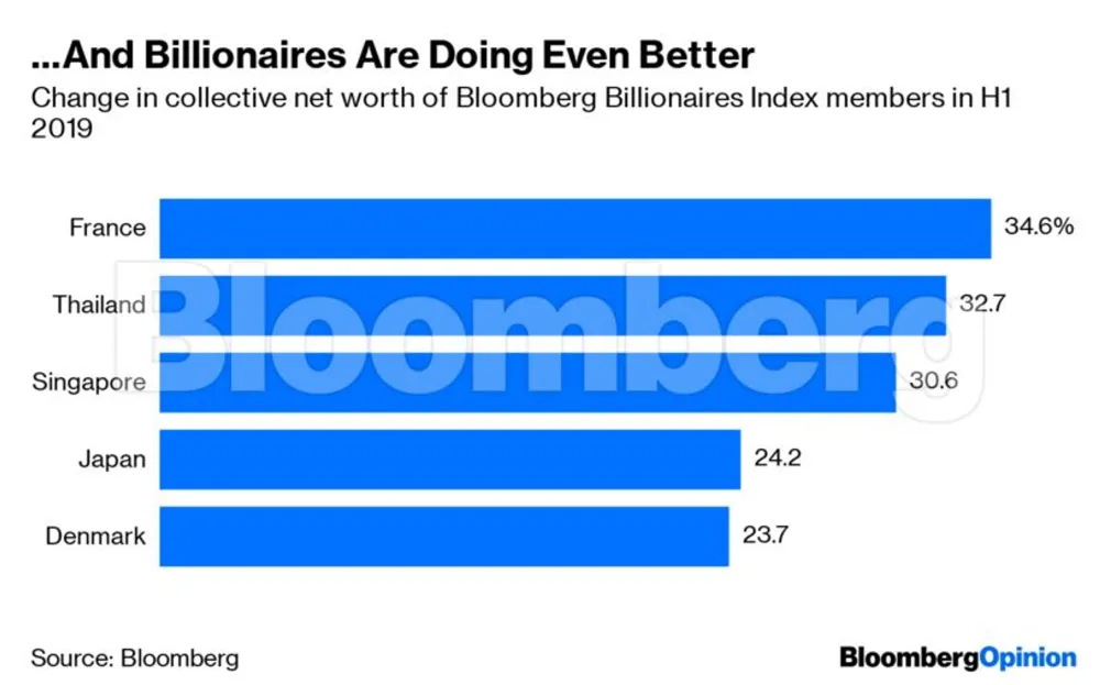 French billionaires aren’t doing badly either. According to the Bloomberg Billionaire Index, their wealth grew quicker than that of every other nation’s tycoons in the first half of 2019. Bernard Arnault, the boss and owner of LVMH Moet Hennessy Louis Vuitton SE, has clinched the spot of world’s second-richest person from Bill Gates. This is unlikely to be greeted with any applause from the public, judging by the outcry after Arnault pledged to help fund the reconstruction of Notre Dame cathedral.