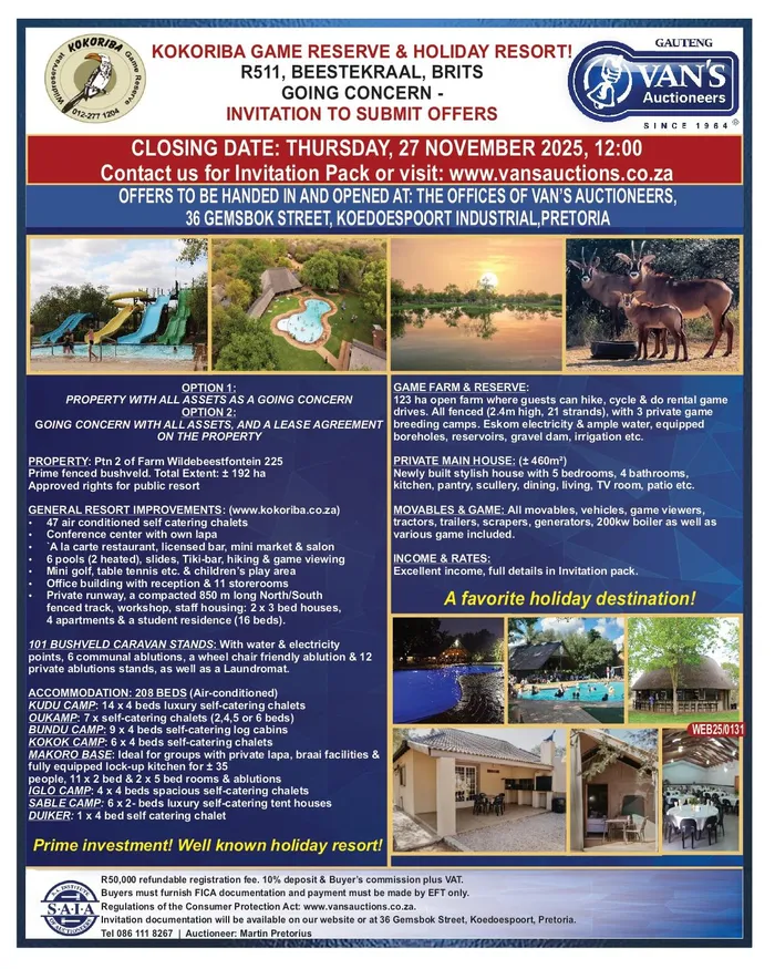 The closing date for the submitting of the Offers is on Thursday 27 November at 12:00, at Vans Auctioneers, Gemsbokstraat 36, Koedoespoort Industria, Pretoria. A refundable registration fee of R50 000 is payable, 10%-deposit, plus buyers commission and VAT is applicable on the successful buyer.