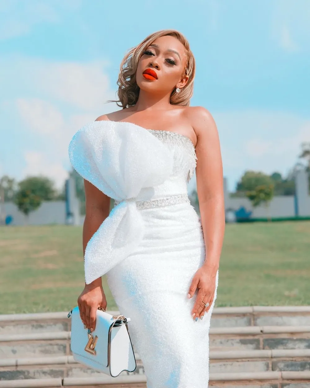 Thabethe looked ravishing in an Orapeleng Modutle white dress with a dramatic bow when she attended Somizi and Mohale's white wedding.