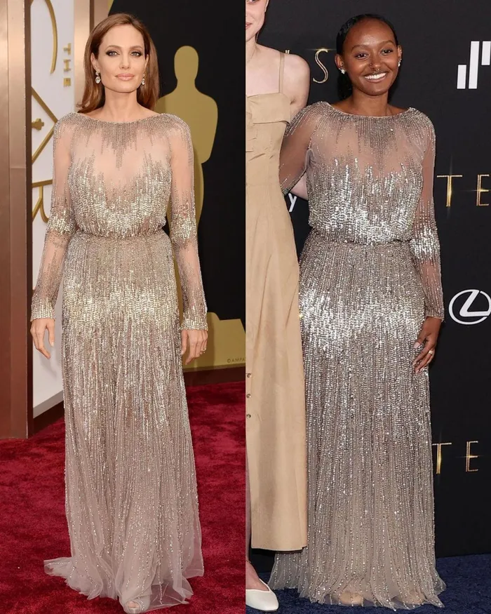 16-year-old Zahara stepped on to the red carpet sparkling in a long-sleeve silver Elie Saab Couture gown featuring sheer panels on the bodice and iridescent beading. The same dress Jolie wore to the 2014 Oscar Awards.