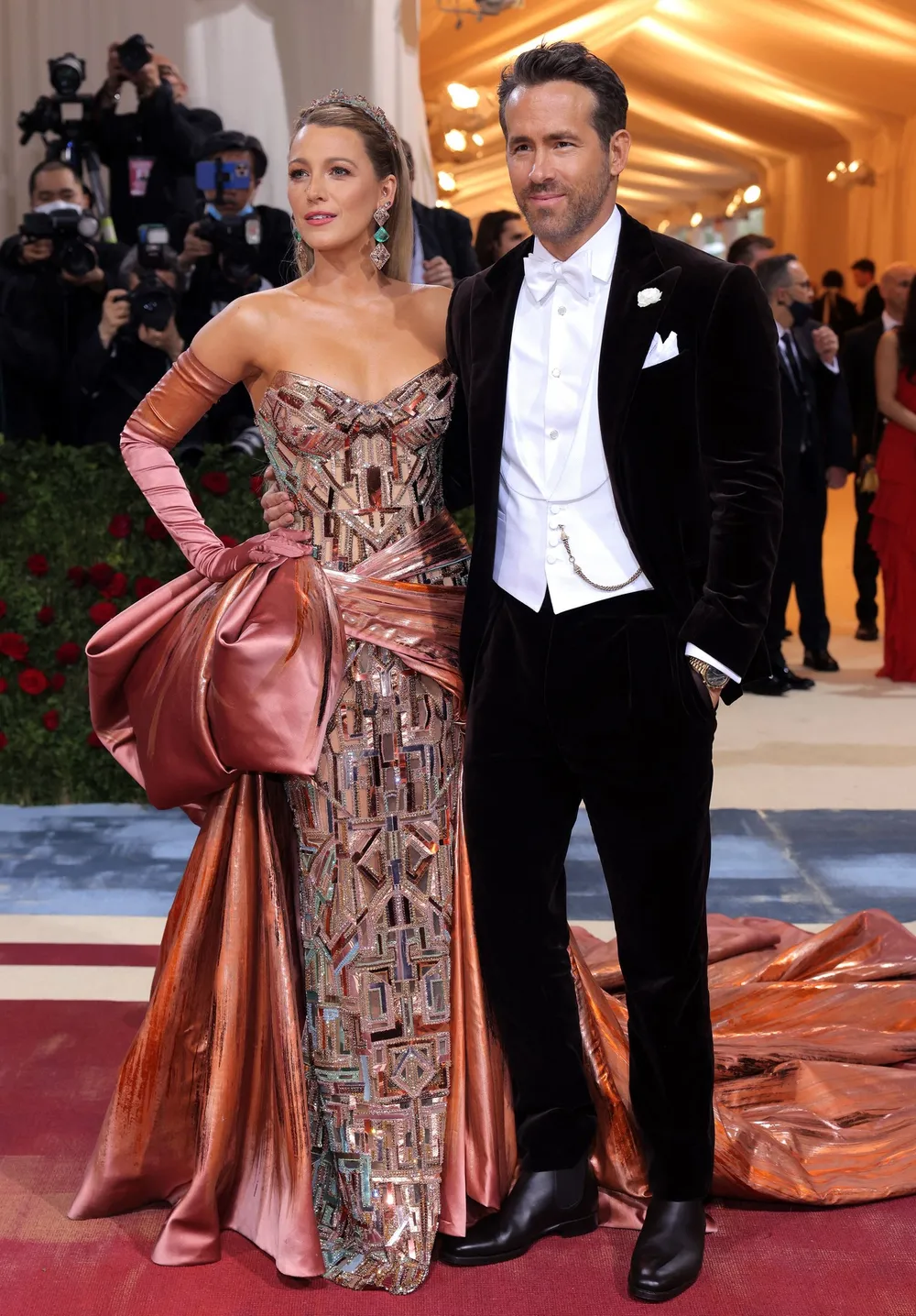 Blake Lively, a Met Gala co-chair along with her husband, actor Ryan Reynolds, arrived in a glittering bronze-coloured Versace dress influenced by New York's Grand Central Terminal, the Statue of Liberty and the Empire State Building.