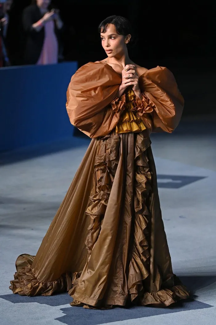 Zoë Kravitz stepped out in a chocolate-brown off-the-shoulder Saint Laurent ball gown that featured ruffles that made the look stand out.