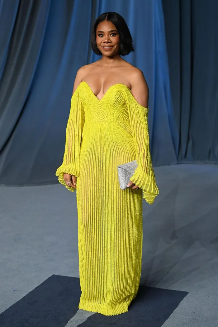 Regina Hall looked like a ray of sunshine as she wore a stunning yellow Cong Tri dress with the off-the-shoulder neckline and sheer, embellished sleeves design.
