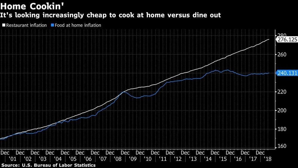“Ten years ago, you had to chop your own onions,” said Bloomberg Intelligence analyst Jennifer Bartashus. “Today, you can go into any grocery store and most of them sell pre-chopped fruits and vegetables. If the biggest driver for eating out was that it’s simply more convenient, that problem is now being solved by a variety of different products and services.”