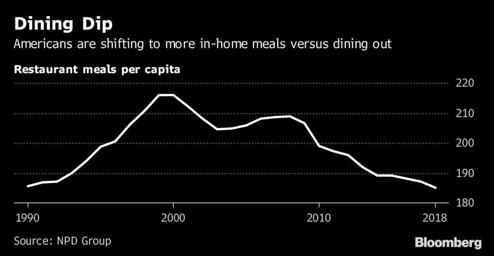 Restaurants are getting dinged by the convenience of Netflix, the advent of pre-made meals, the spread of online grocery delivery, plus crushing student debt and a focus on healthy eating. Eighty-two percent of American meals are prepared at home -- more than were cooked 10 years ago, according to researcher NPD Group Inc. The latest peak in restaurant-going was in 2000, when the average American dined out 216 times a year. That figure fell to 185 for the year ended in February, NPD said.