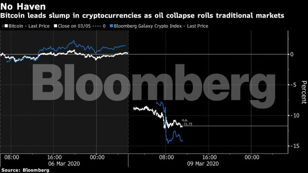 INTERNATIONAL - Cryptocurrencies are not immune to the gyrations rocking global markets, plunging along with a broad range of assets on Monday in the wake of the collapse in crude oil prices.