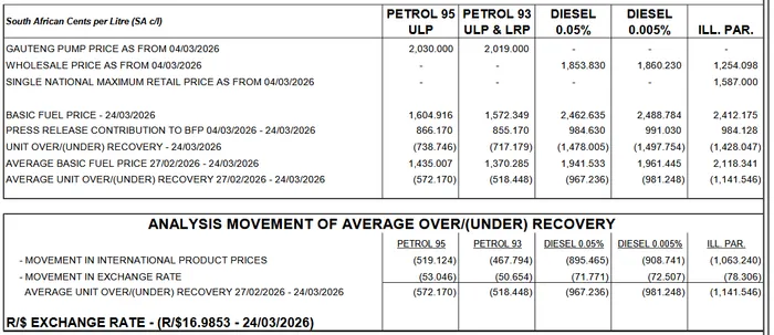 95 Unleaded currently costs R19.47 at the coast and R20.30 in Gauteng, where the cheaper 93 Unleaded retails for R20.19. April’s estimated price of R26.23 for 95 Unleaded inland brings the fuel close to its all-time record of R26.74 in July 2022. Petrol hit highs of R25.68 in 2023, R25.49 in 2024 and R22.34 in 2025.