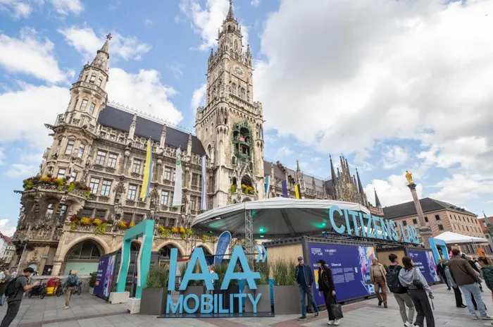 People walk past the public zone at the Open Space of the 2025 IAA Mobility in Munich, Germany.