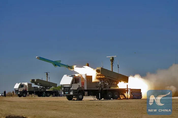 a missile is launched during an Iranian naval drill from the coastline of the sea of Oman in southern Iran