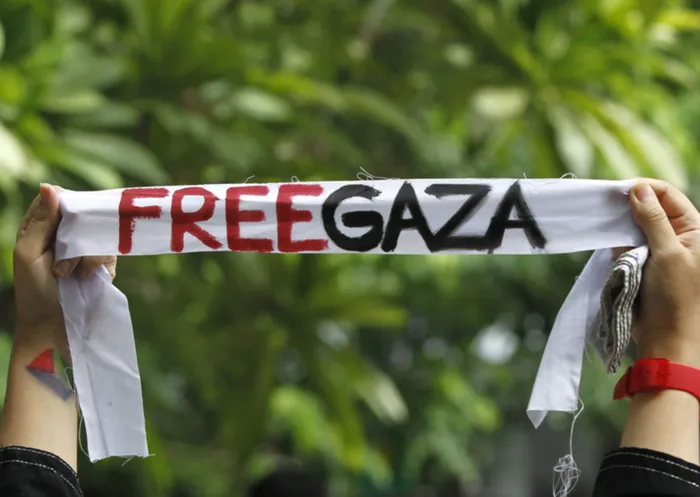 A demonstrator holds up a headband during an anti-Israel protest in front of the Israeli embassy in Bangkok, Thailand. Picture: Chaiwat Subprasom A demonstrator holds up a headband during an anti-Israel protest in front of the Israeli embassy in Bangkok, Thailand. Picture: Chaiwat Subprasom