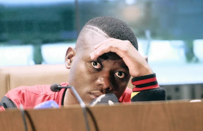 Face of a man before microphones #FeesMustFall activist Bonginkosi Khanyile appeared in court on Friday. File Picture