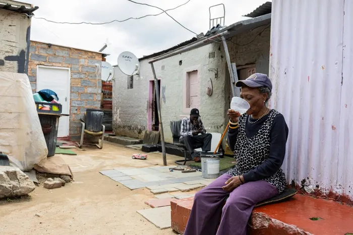 Mary (R), 72, drinks water outside her dwelling in the informal settlement of Innesfree park in Johannesburg, on November 14, 2025. Wealth inequality is a global emergency that threatens democracy and social cohesion, experts warned, urging G20 leaders meeting in South Africa this month to establish a panel to tackle the crisis.