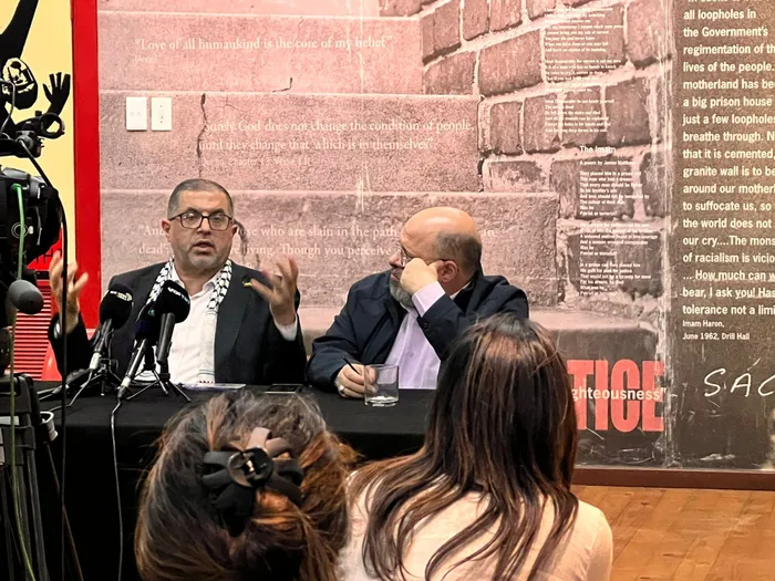 Members of the media heard from Hamas representative in Iran, Khaled Qaddoumi, and senior Hamas official and former Gaza health minister, Basem Naim at a media conference. Picture: Lance Witten / IOL