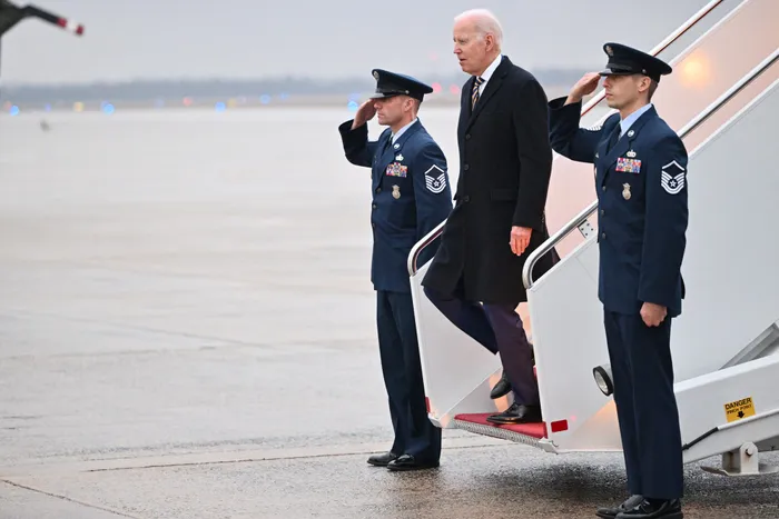 US President Joe Biden steps off Air Force One upon arrival at Andrews Air Force Base in Maryland on January 31, 2023. Biden travelled to New York to speak on how the Bipartisan Infrastructure Law will provide funding for the Hudson River Tunnel project. Picture: Mandel Ngan AFP