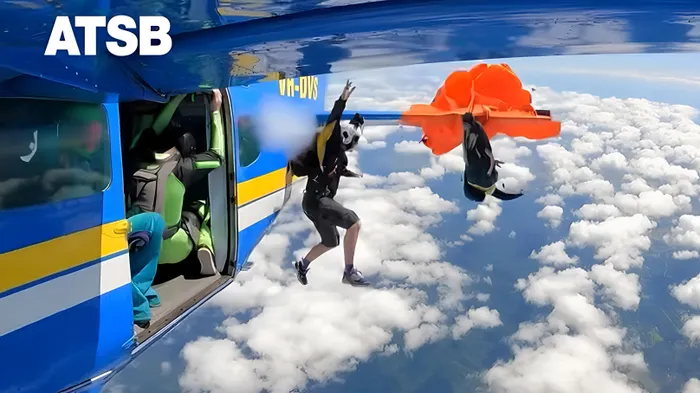 A video released by the Australian Transport Safety Bureau showed the participant's reserve parachute being activated after its handle snagged the wing flap of the plane.