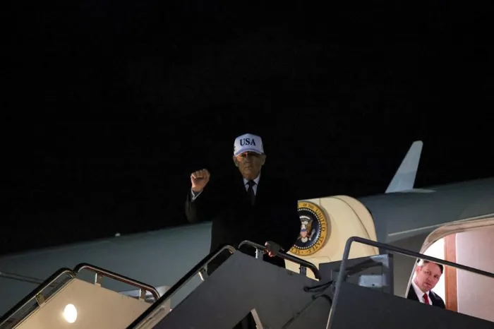 President Donald Trump gestures towards the members of the press traveling with him as he steps off of Air Force One on January 11, 2026 after landing at Joint Base Andrews, Maryland. The President spent the weekend at his private club Mar-a-Lago in Palm Beach, Florida.