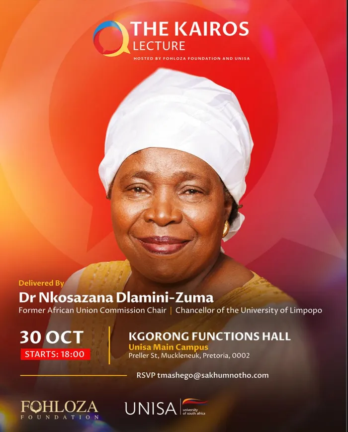 The 3rd Kairos Lecture, to be presented by Dr Dlamini-Zuma, with Professor LenkaBula as a respondent, will be hosted by Unisa and the Fohloza Foundation; and represents a critical intellectual and moral engagement with the continuing relevance of the Kairos tradition in contemporary socio-political and theological discourse.